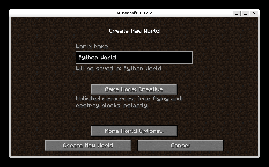 World Nameに好きな名前を入れて、ゲームモードは Game Mode: Creative にして、画面左下のCreate New World をクリック