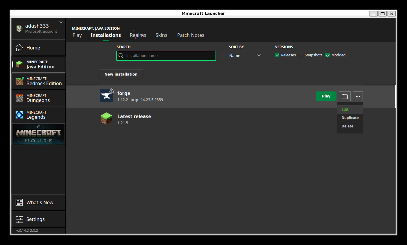 forge のところにマウスを持ってくると、以下のように 、右側に Play とかが表示されるので、一番右側の「・・・(3点リーダー)」 > Edit の順にクリック
