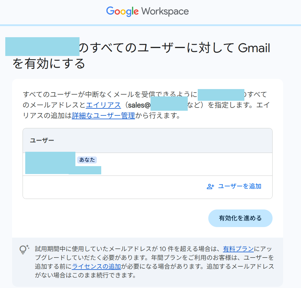 Gmailを有効にする という以下のような画面が出てくるので、指示に従いやってみます。