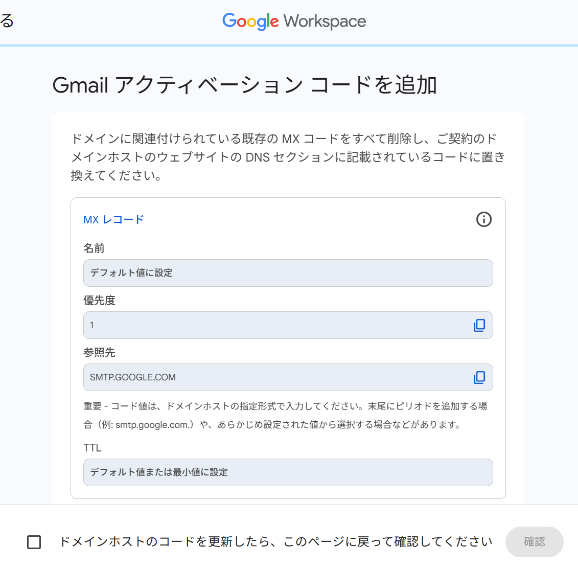 と入力すると、うまくいきました。SMTP.GOOGLE.COM の後に、ピリオド「.」を追加するところがポイントのようでした(エラーが出ていたので、Geminiにエラー画面をアップロードしたら教えてくれました)。