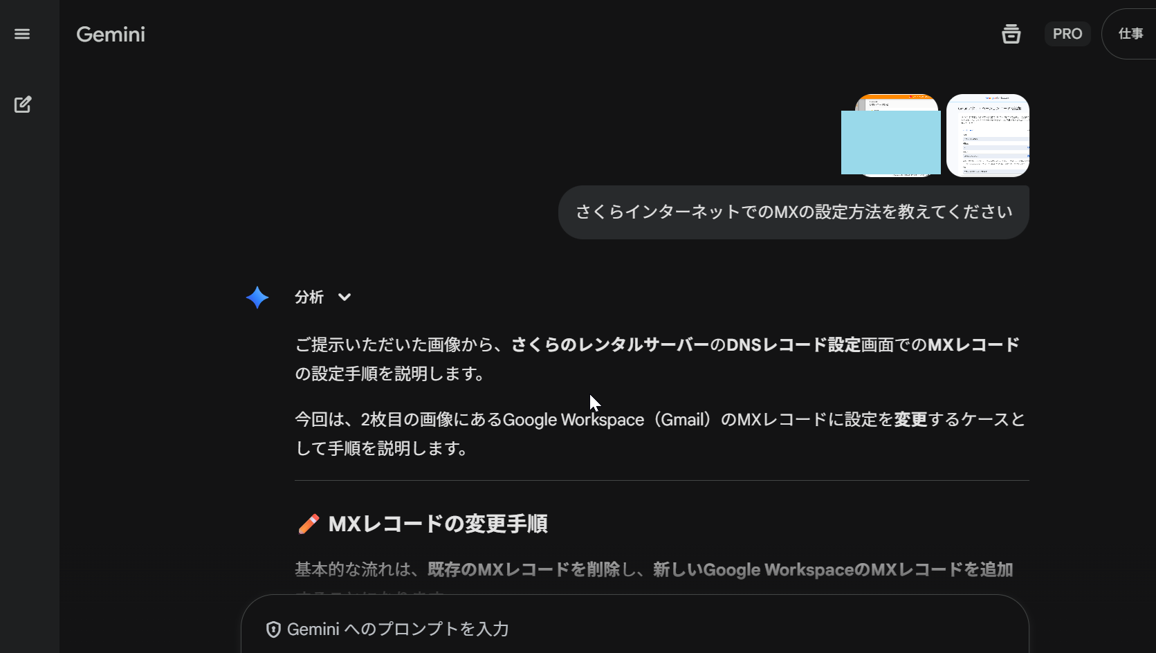 ここから、どうしたらよいのか分からないので、Googleとさくらインターネットの両方のスクリーンショットをとり、Geminiにやり方を聞いてみました。(最初、ChatGPTに聞いたら、あきらかに間違った答えでした。)