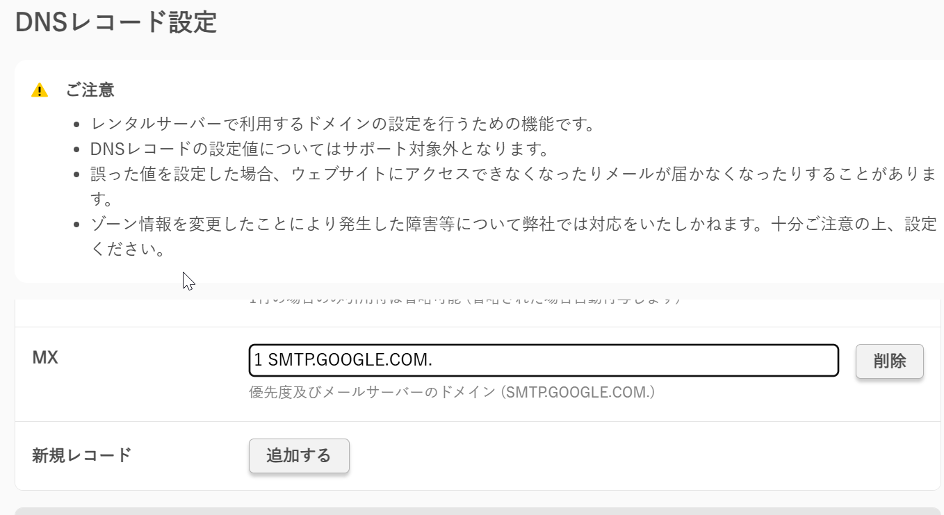 次に、新規レコード の右の 「追加する」をクリックして、MX を新規追加します。 MXの横の空欄に、