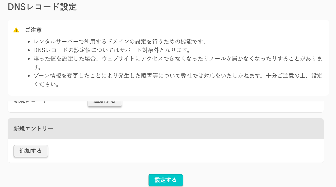 設定をしたいドメインの右側の 設定 > DNSレコード設定