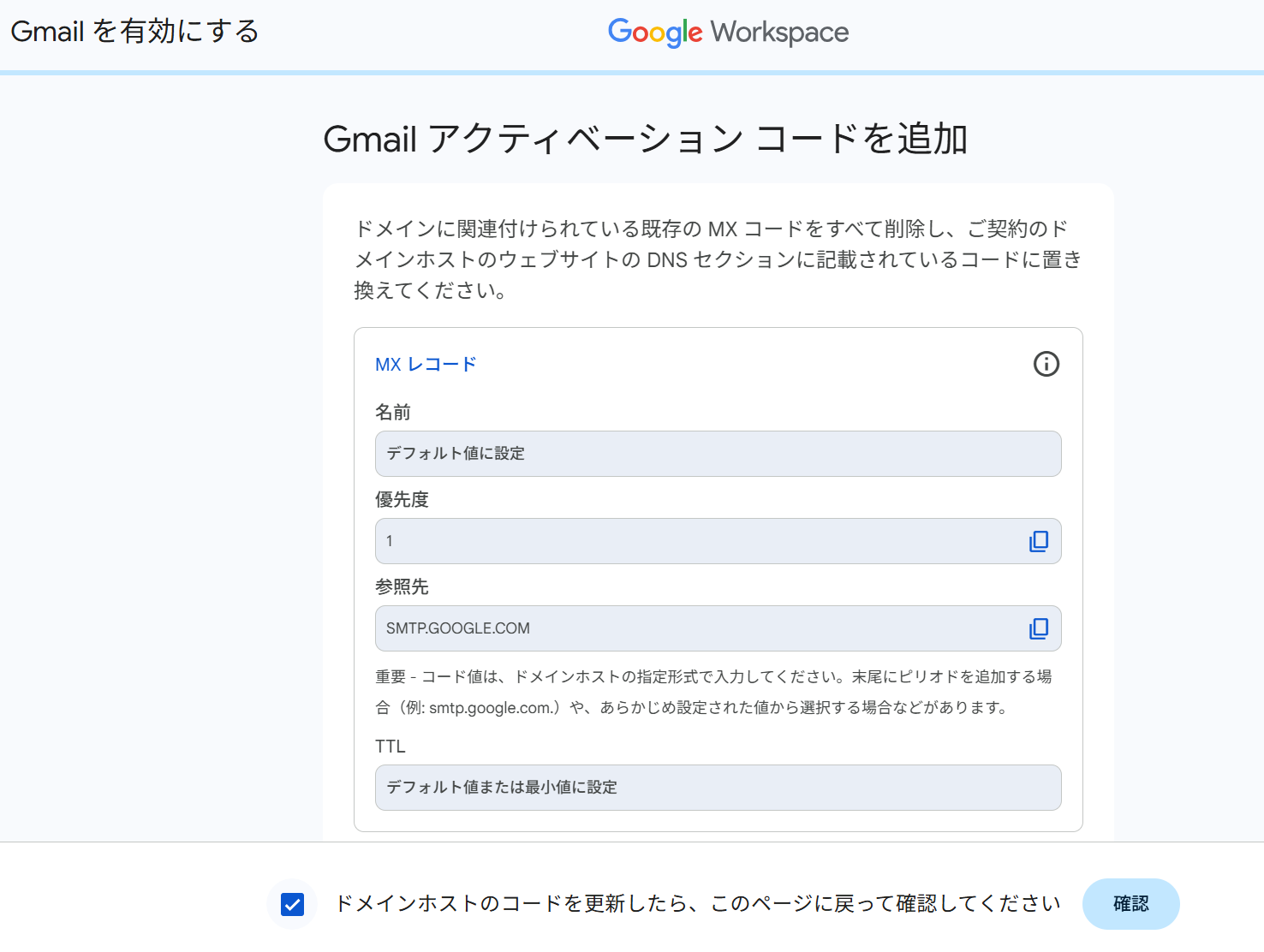Gmailの設定に戻って、画面左下のチェックボックスをONにして、「確認」をクリック。
