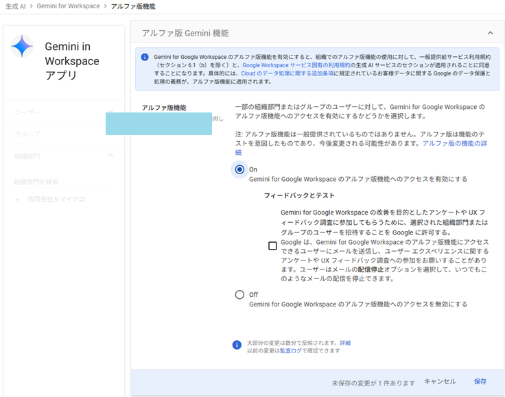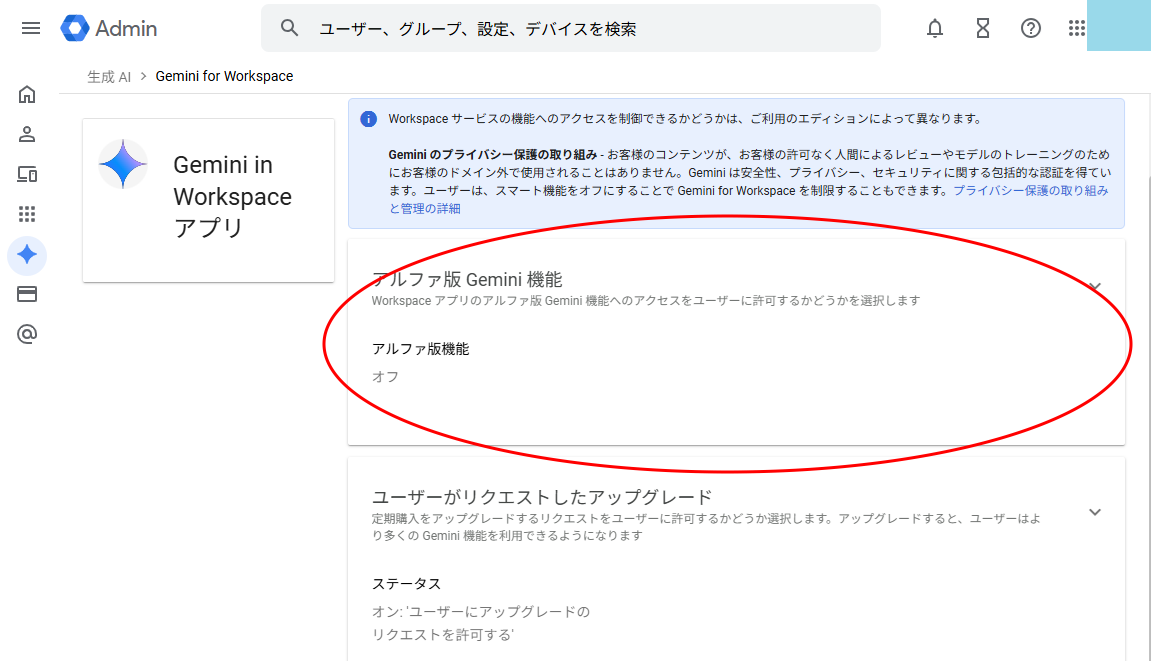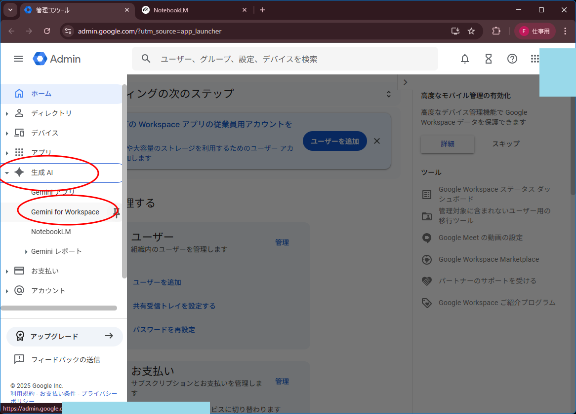 左上の「三本線マーク」> 生成AI > Gemini for Workspace の順にクリック