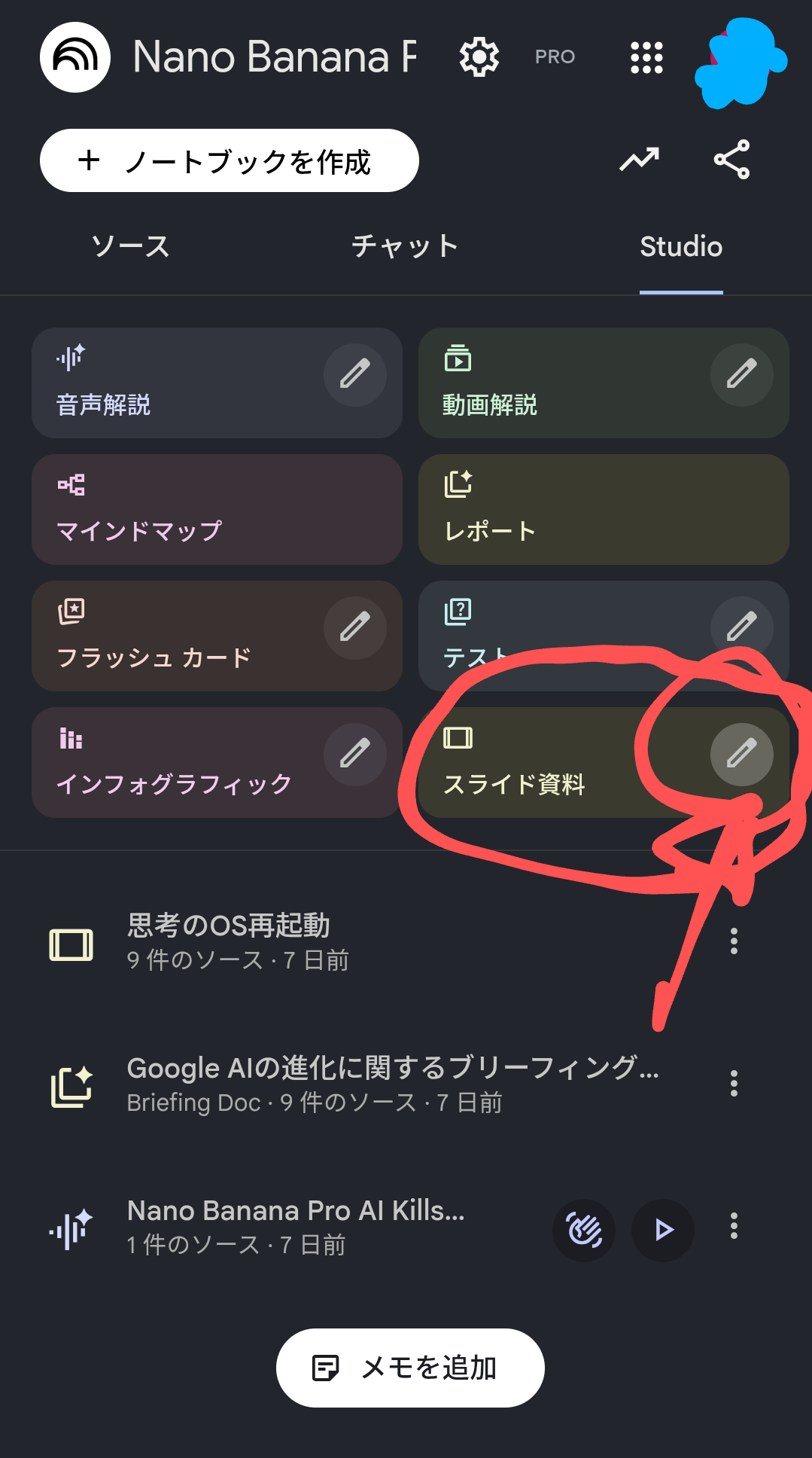 - Studio タブ > スライド資料 の中のエンピツマークをクリック