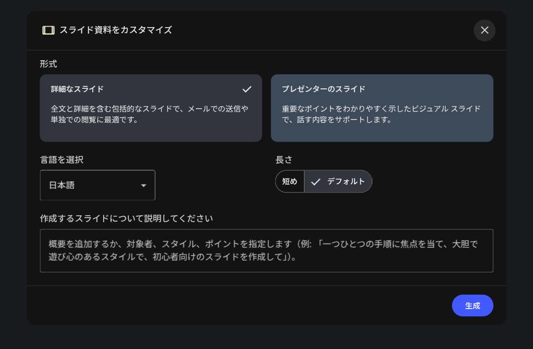 - スライドの内容をGeminiに考えてもらい、テキストで出力(Googleドキュメントに保存がよい)