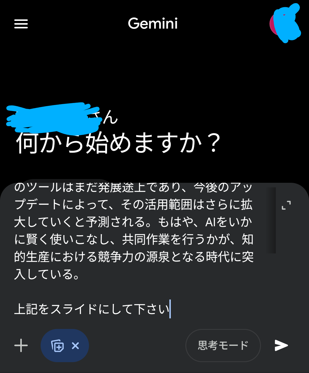 - 思考モード になっていることを確認。もし、「高速モード」になっていたら、「思考モード」に変更する