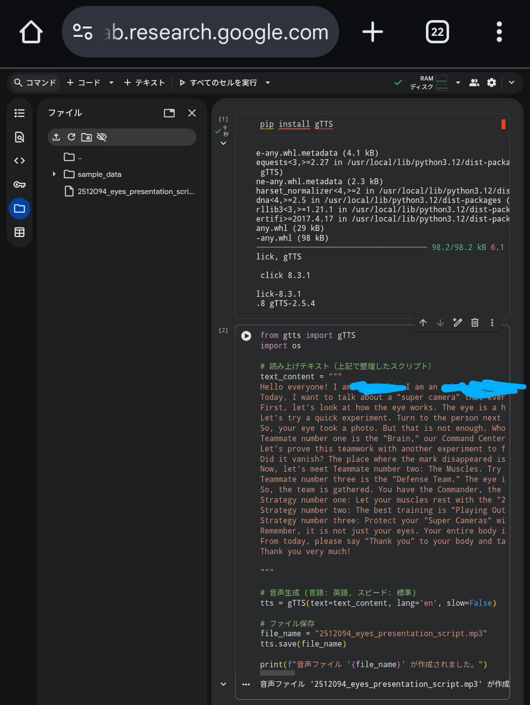 - 英語で発表しなければいけないときや、発表内容を暗記したい場合は、音声ファイルを作成して繰り返し聞くとよいかも → Google AI Studioで、Text to Speechを使うと簡単かも https://aistudio.google.com/ と思ったが、なかなかうまくいかず。Google ColaboratoryでgTTSをpip installして、mp3ファイルを作成する方が早かったです。