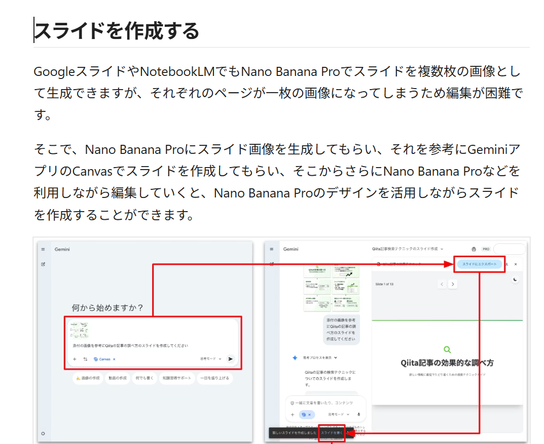 https://qiita.com/b-mente/items/b62ba6b073c8b77860b4 意外と便利なNano Banana 2025.12 → NotebookLMでスライド作成してから、1枚ずつ、GeminiのCanvasでスライド作成してもらえば、ほぼ解決か。でも、面倒。。。