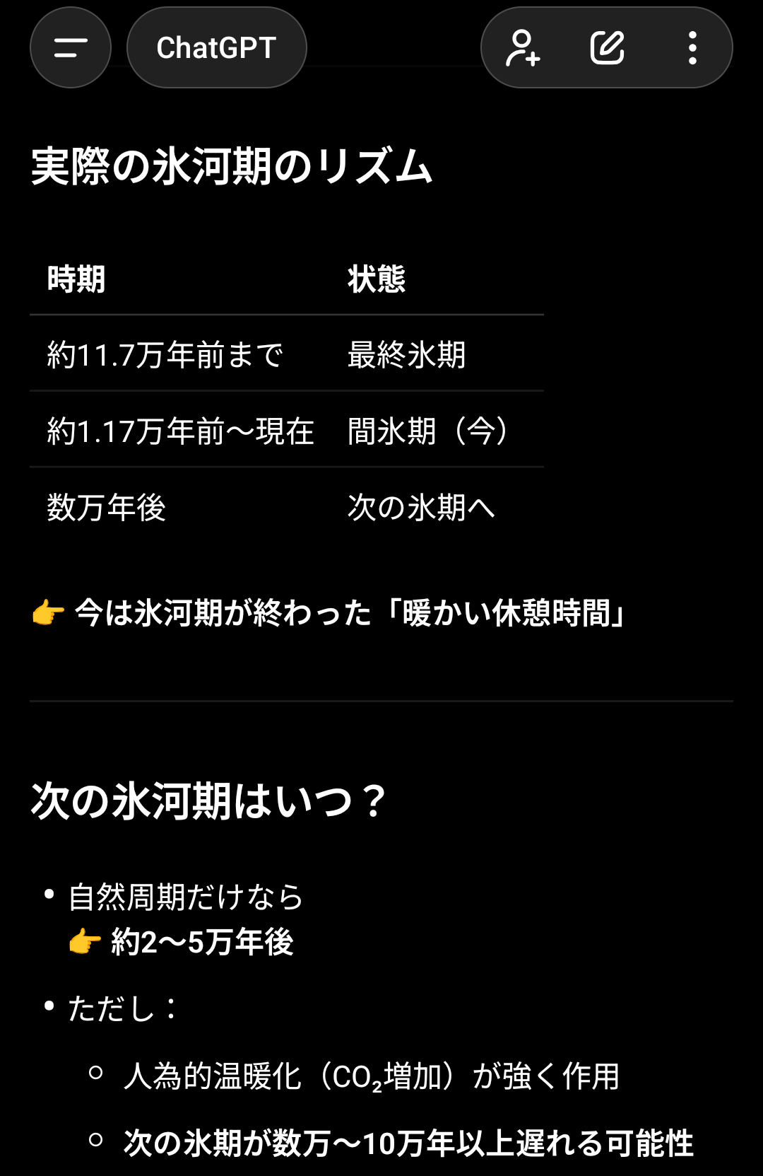 - 氷河期 or 太陽の活動 or 地球温暖化