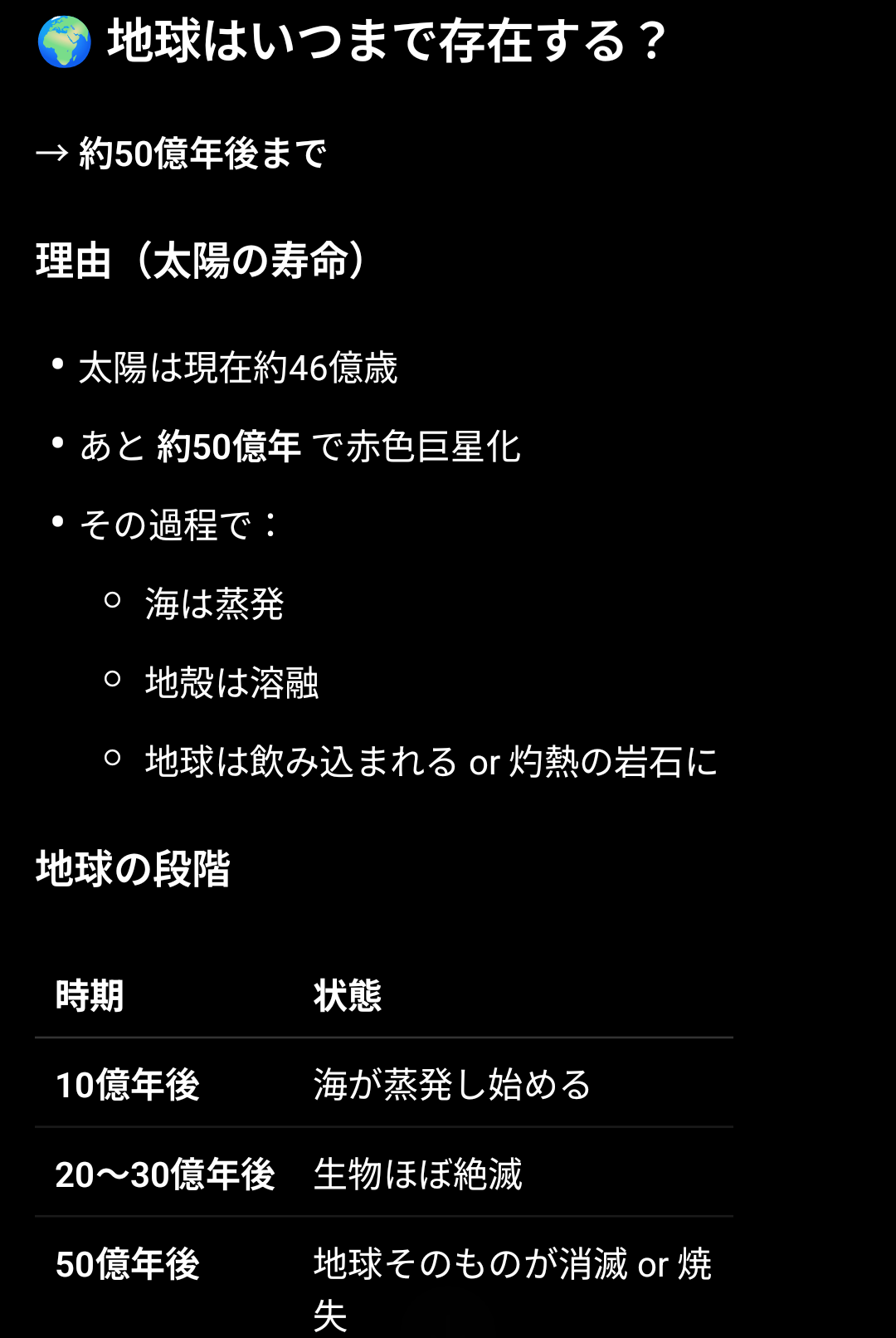 ChatGPTに聞いてみたら、また10万年くらいはヒトが住めるそうです。