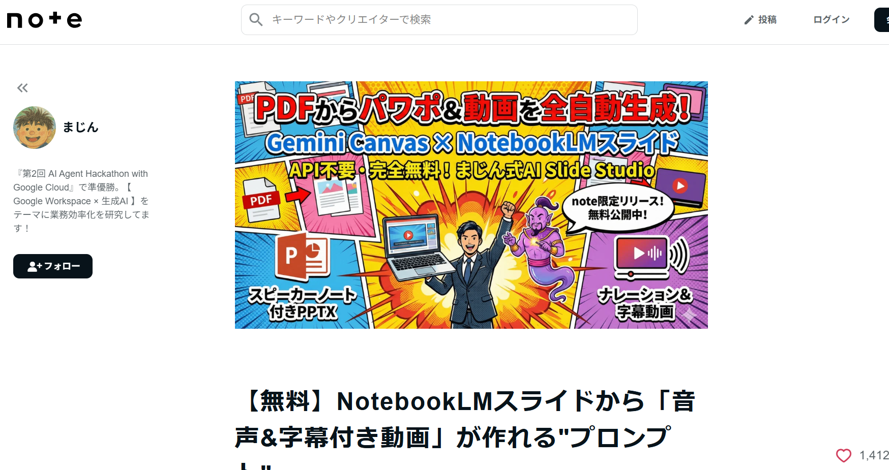 https://note.com/majin_108/n/n28cebe38881d 【無料】NotebookLMスライドから「音声&字幕付き動画」が作れる"プロンプト"