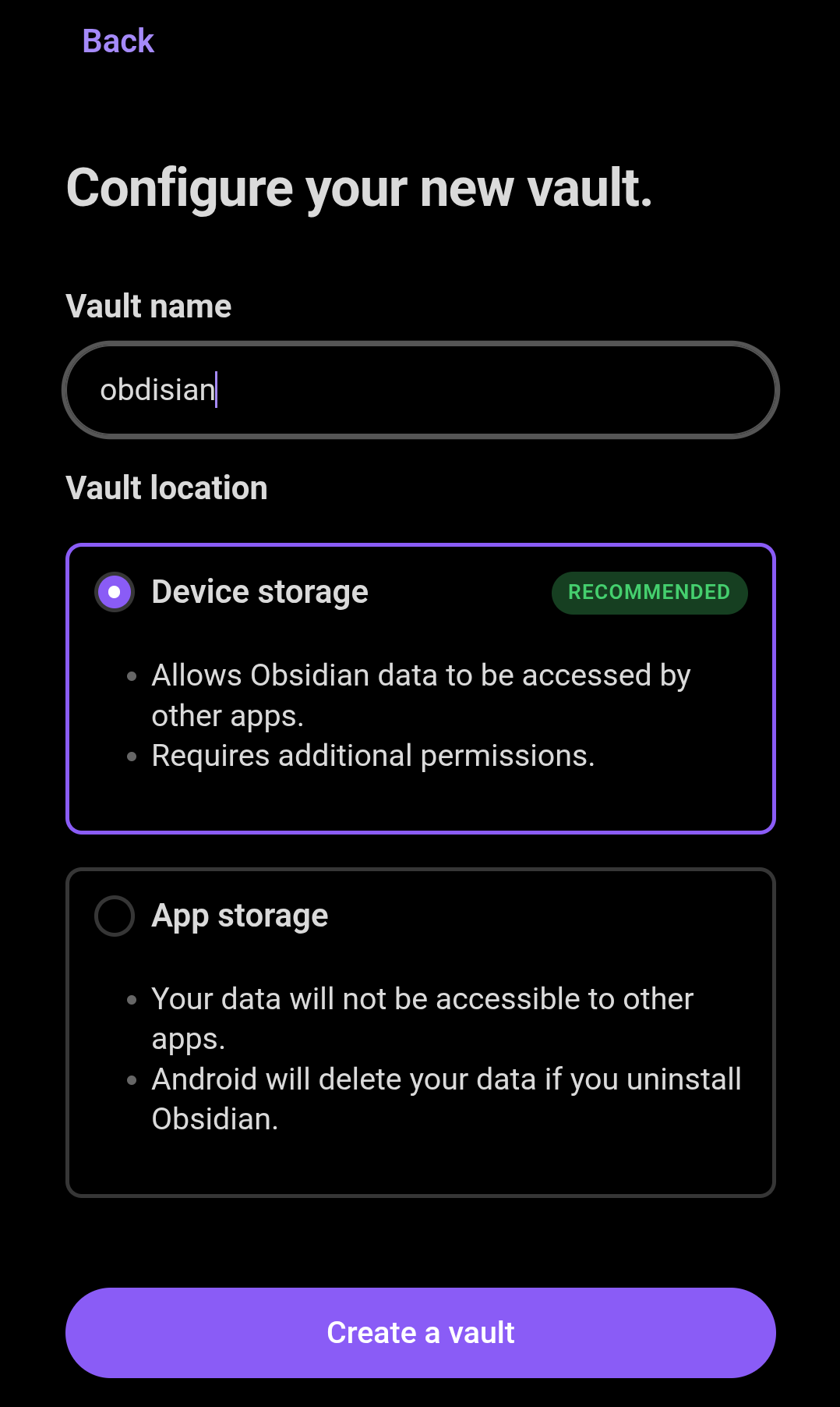 とりあえず、スマホの中にVault(ボルト?ファイルの保管場所)を指定。後で、Dropboxに移動する予定です。