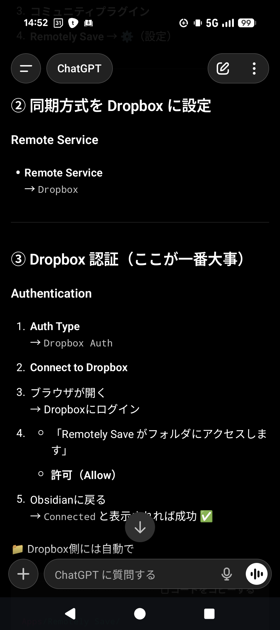 やり方をChatGPTに聞くきながらDropboxにObsidianのフォルダ(Vault)を設定して複数端末で使用できるようにする