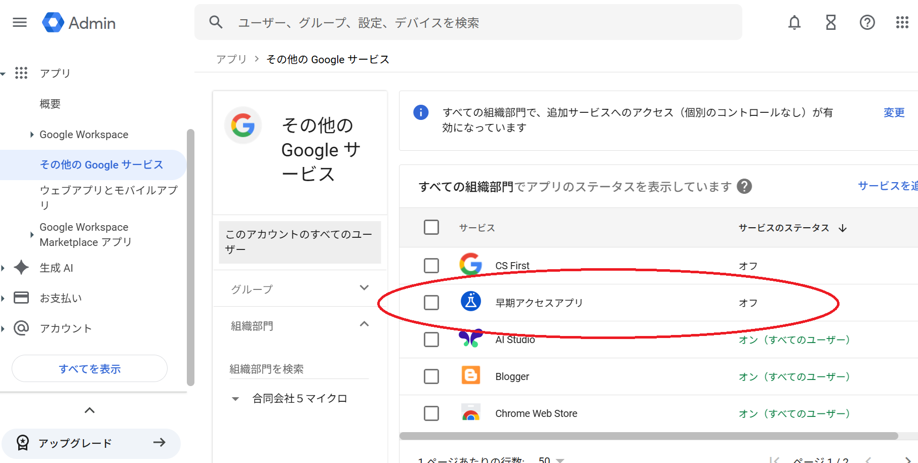 2026年1月現在、Workspace Standardだと初期設定ではOpalを使用できないので、Adminで入って、「アプリ」>「その他のGoogleサービス」で、「早期アクセスアプリ」の、をONにします。