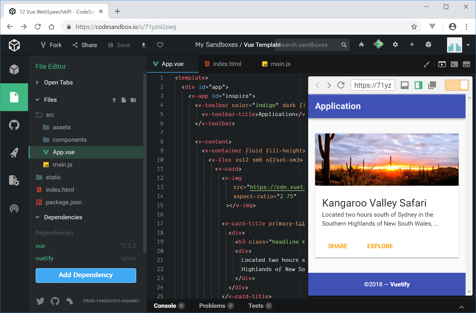 02.codesandboxのvue.jsでvuetifyテンプレート