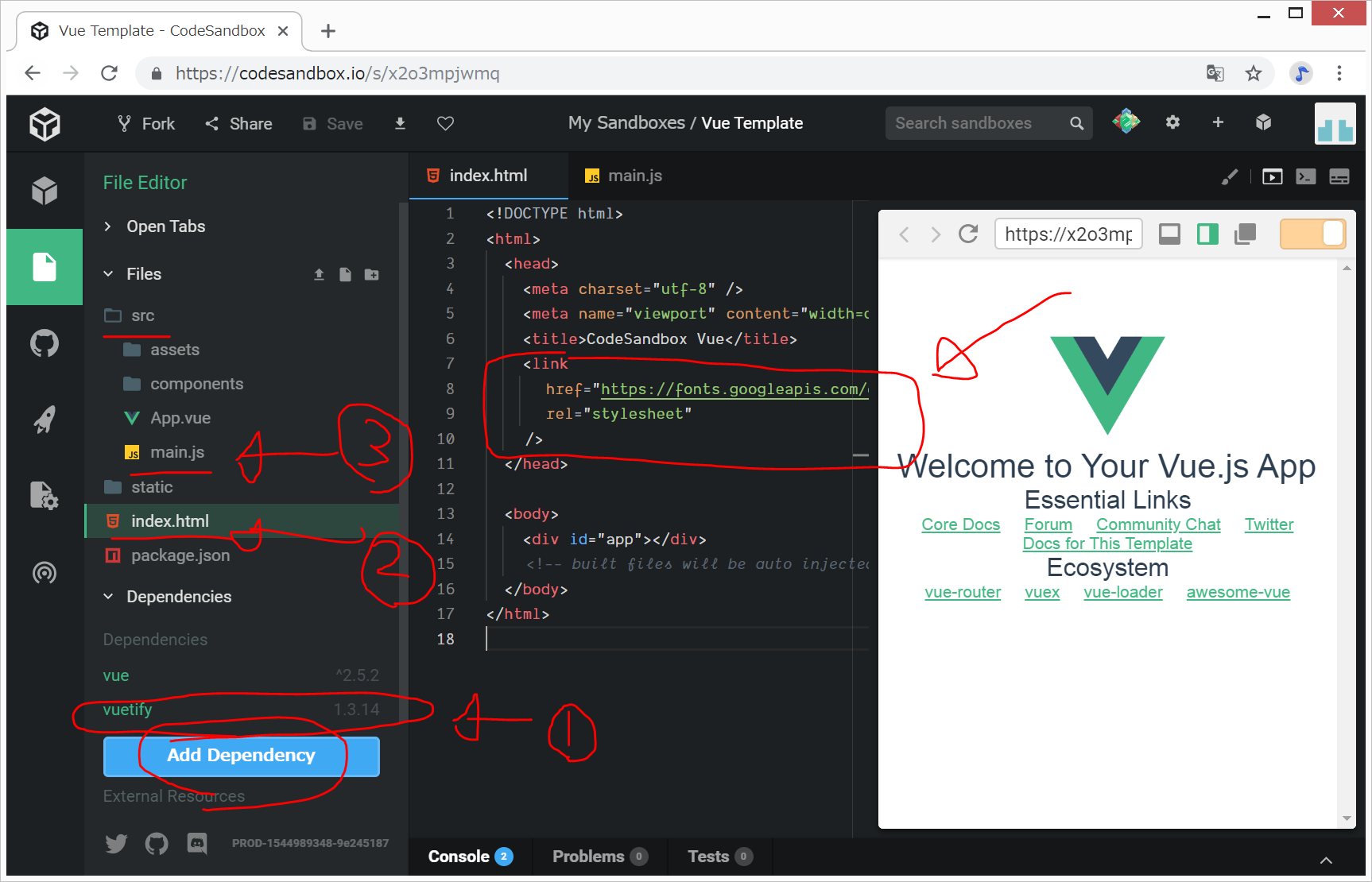 02.codesandboxのvue.jsでvuetifyテンプレート